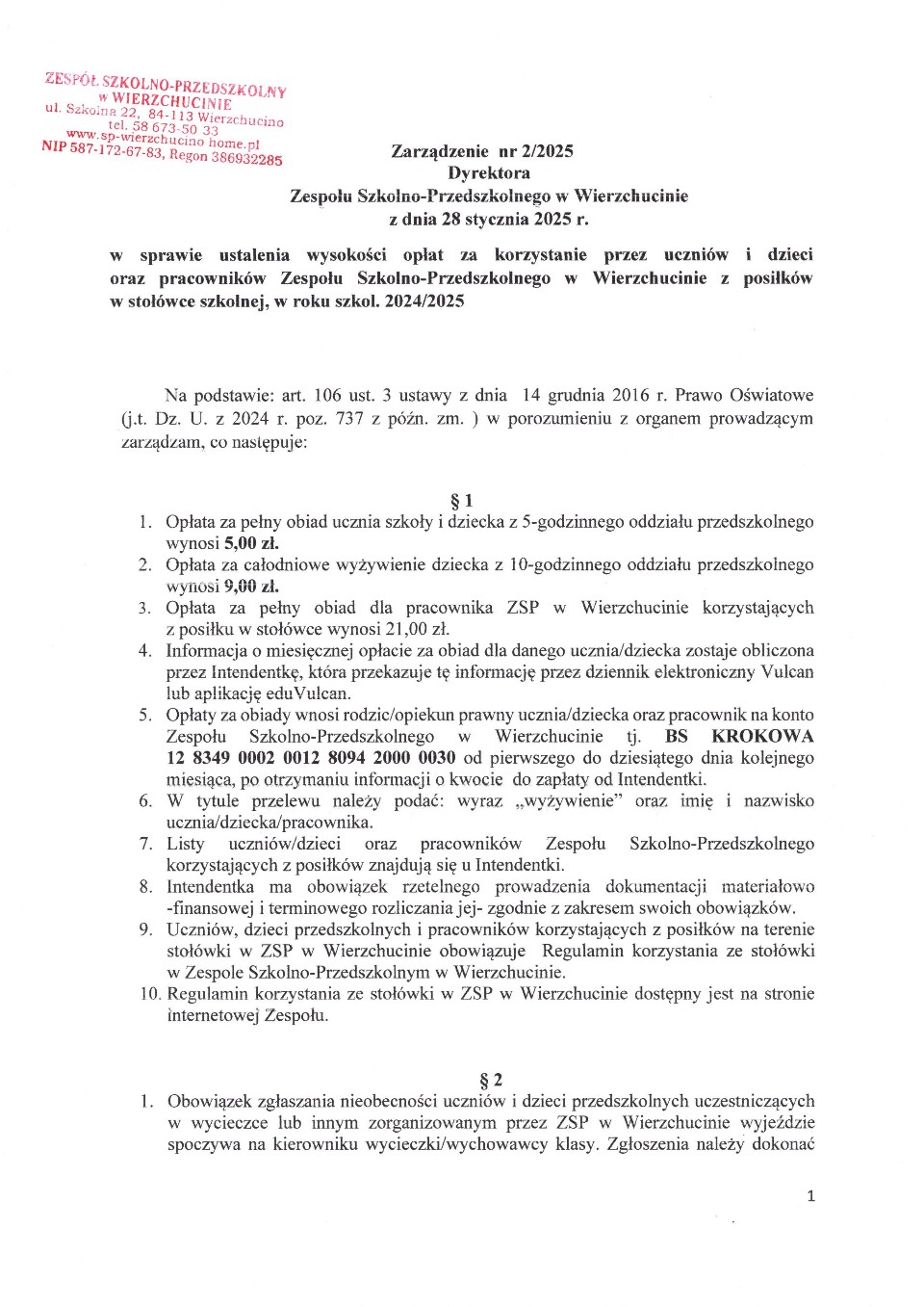 Zarządzenie 02/2025 - Zespół Szkolno-Przedszkolny w Wierzchucinie